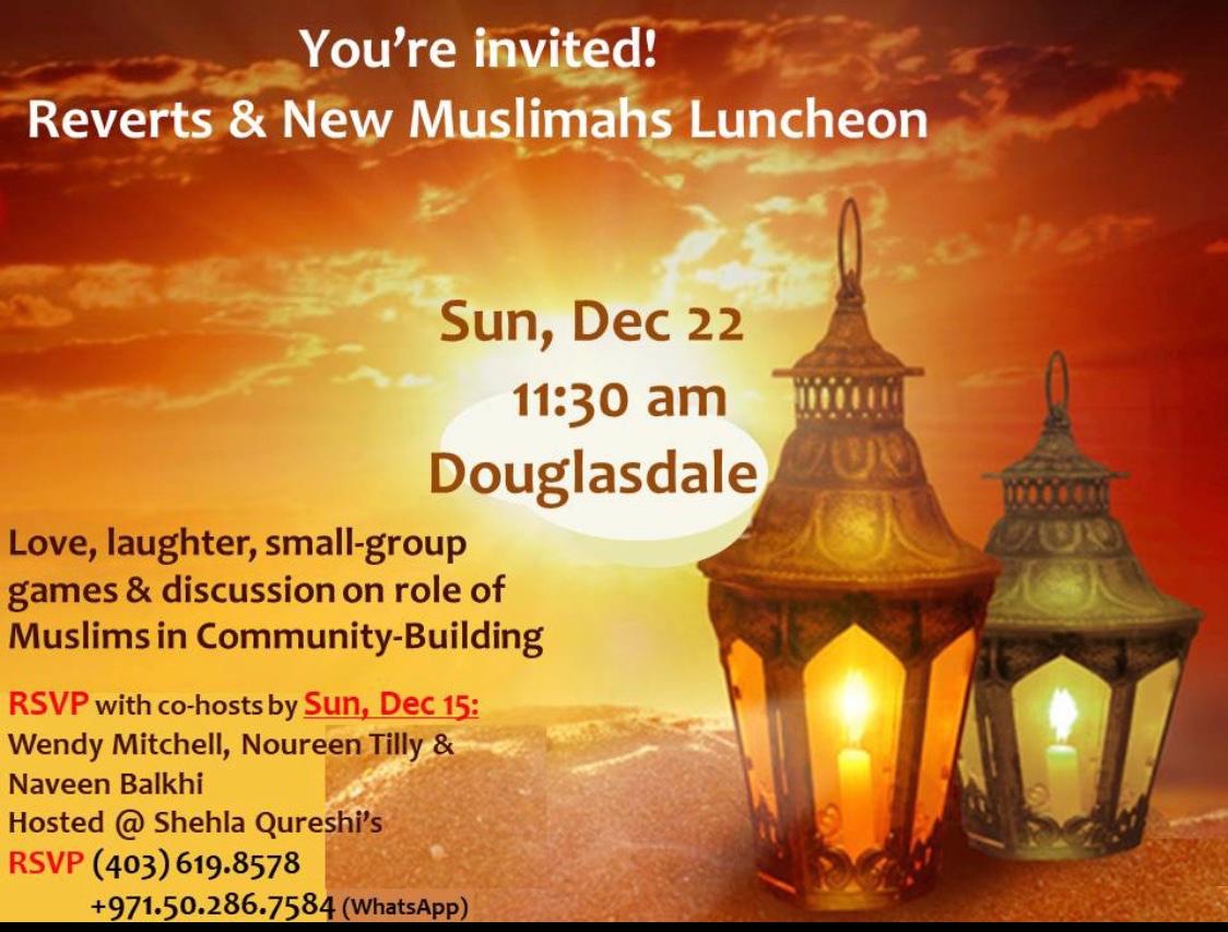 This message is for all Reverts and New Muslimahs of Calgary. We would be honoured to have you join us Sunday Dec 22, at 11:30 am for an afternoon of bonding, learning and growing.